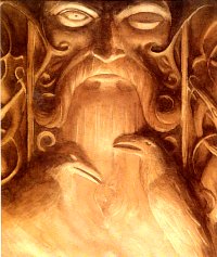 Odin's areas of control were: wisdom, magic, and warfare. Odin was often portrayed as the grey-bearded old man with one eye, his face hidden by a hood or a broad brimmed hat, because he had cast an eye into Mimir's well in return for a drink of its "immense wisdom". Even after losing an eye, Odin's love of wisdom was so profound that he was prepared to sacrafice himself to plumb its depths. He gained insight by hanging himself for nine days from Yggdrasil, the cosmic tree (imagery: think of the movie Conan when he was tied to the Tree of Woe). This voluntary death, and his subsequent resurrection by means of magic gave Odin greater wisdom than anyone else. It is possible that the obvious parallel between this myth and the Crucifixion gave Christianity a head-start in northern Europe. |